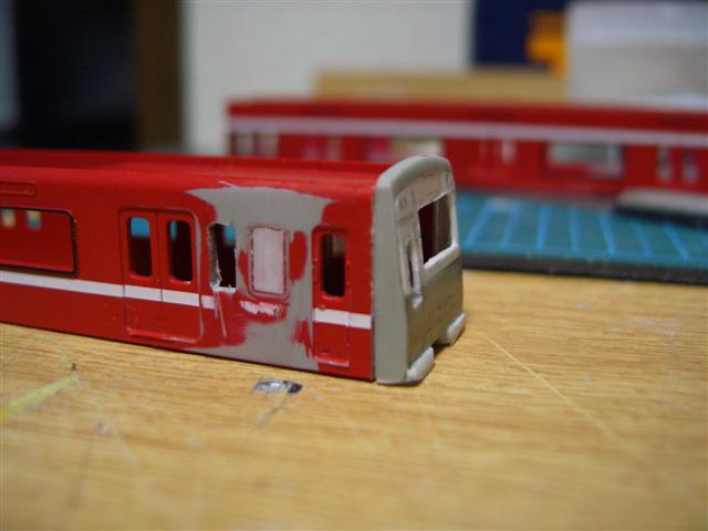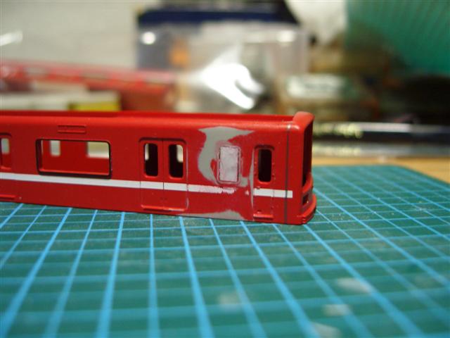 運転台後の窓の位置が違うので、はめ込み窓とプラ板で埋めます。